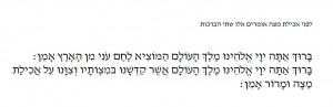 Bendito sejas, YHWH, nosso Deus, Rei do Universo, que nos santifica com seus mandamentos, e que nos ordenou comer pães sem fermento e ervas amargas, Amém (escrito por hakhams).